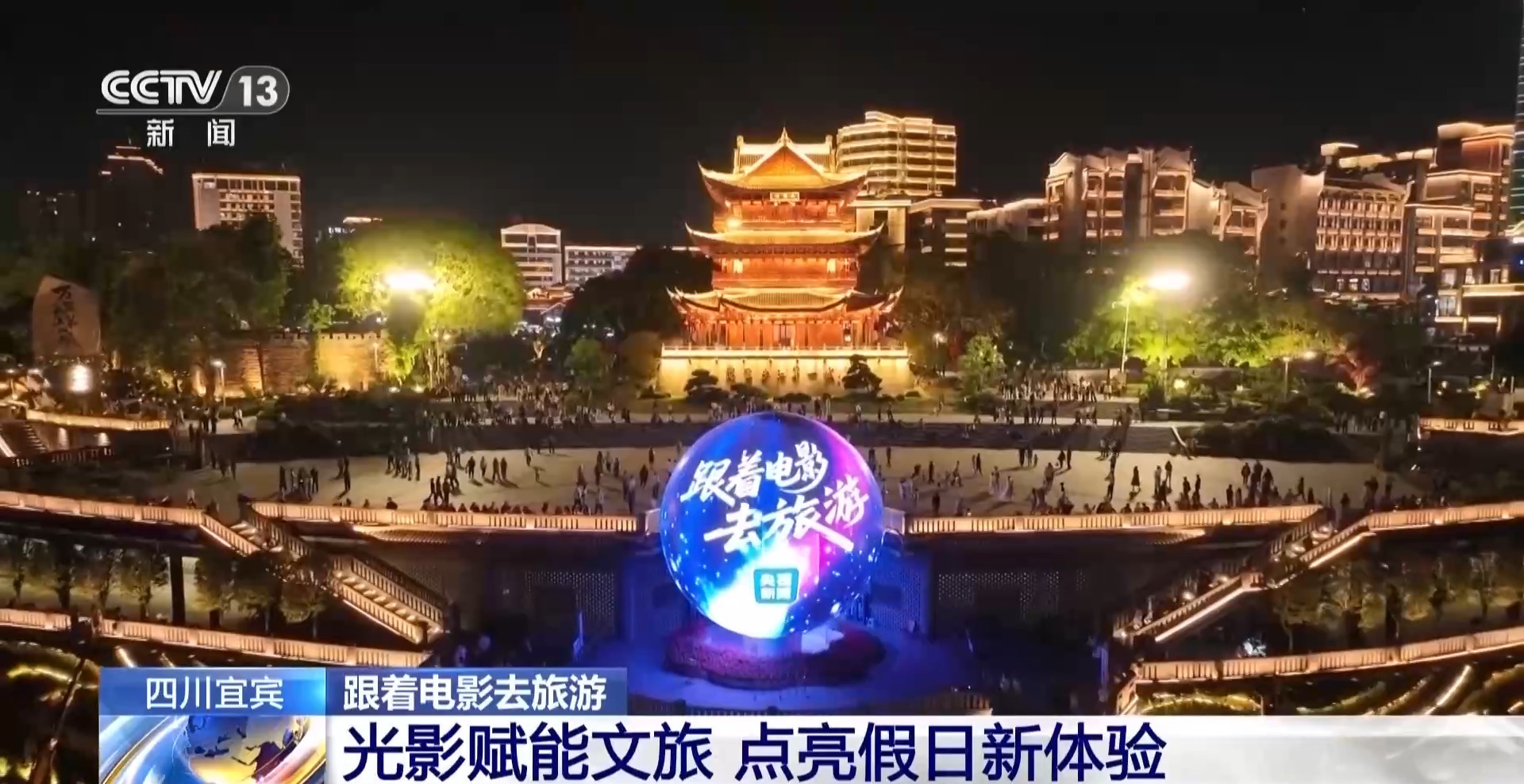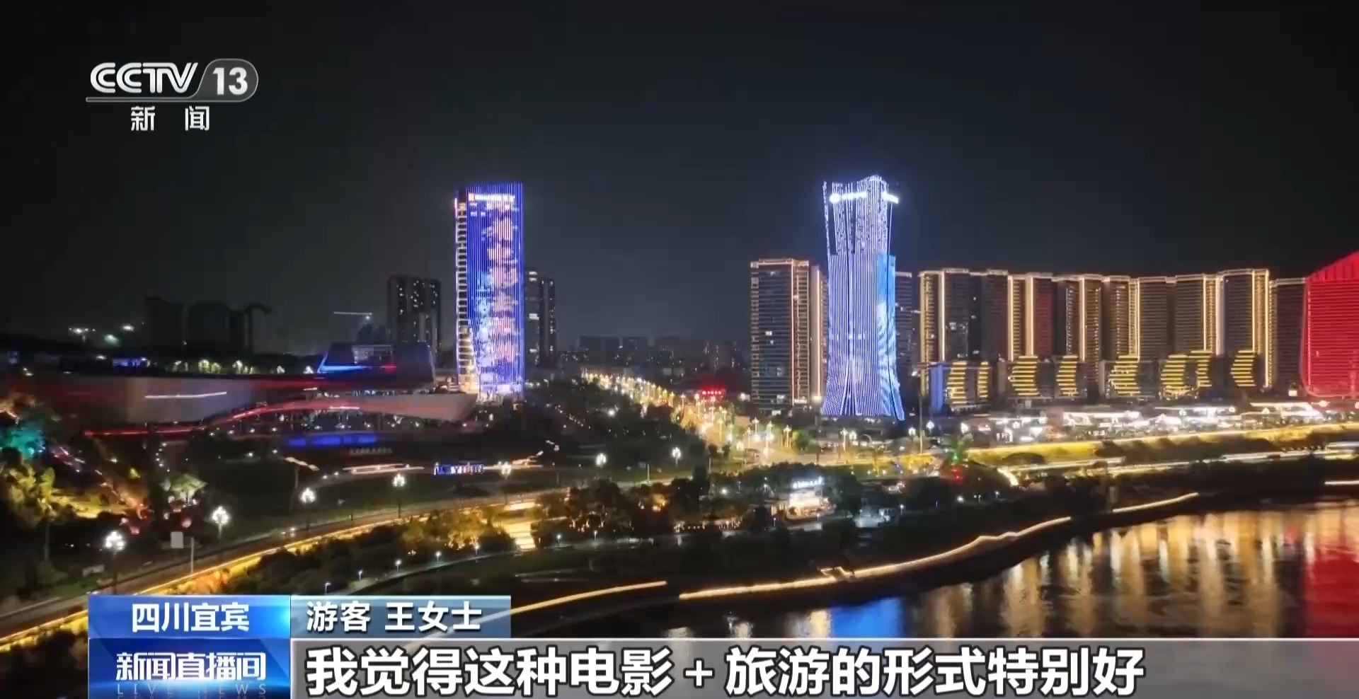 游客 王女士:我是外地过来玩的,宜宾的夜景真的把我震撼到了,而且刚才看到好多地标亮灯说跟着电影去旅游,我觉得这种电影+旅游的形式特别好,五一我也打算带着家人先去影院看看电影,再跟着电影去感受一下大美中国。