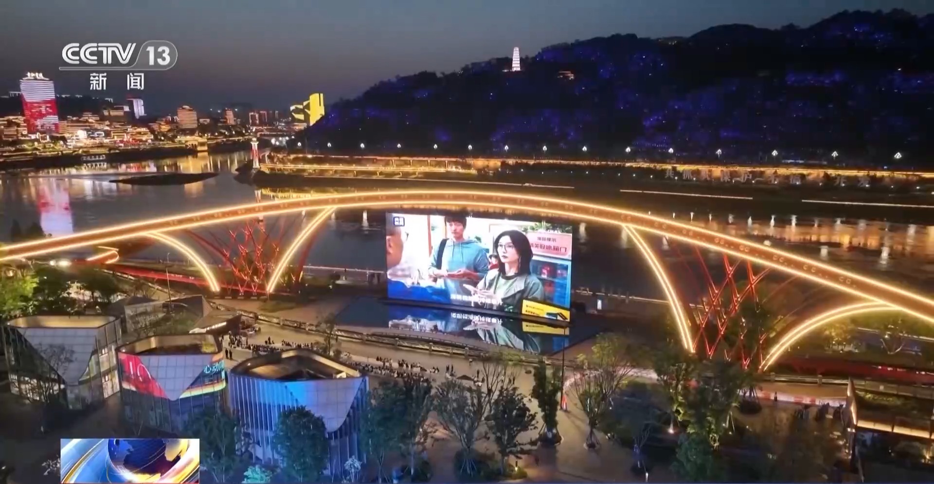 总台记者 王玉龙:在四川宜宾的水幕广场,水幕电影大屏滚动播放五一档电影预告片。宜宾的城市地标也已经点亮主题光影,璀璨光影与三江夜景交相辉映,氛围感拉满。