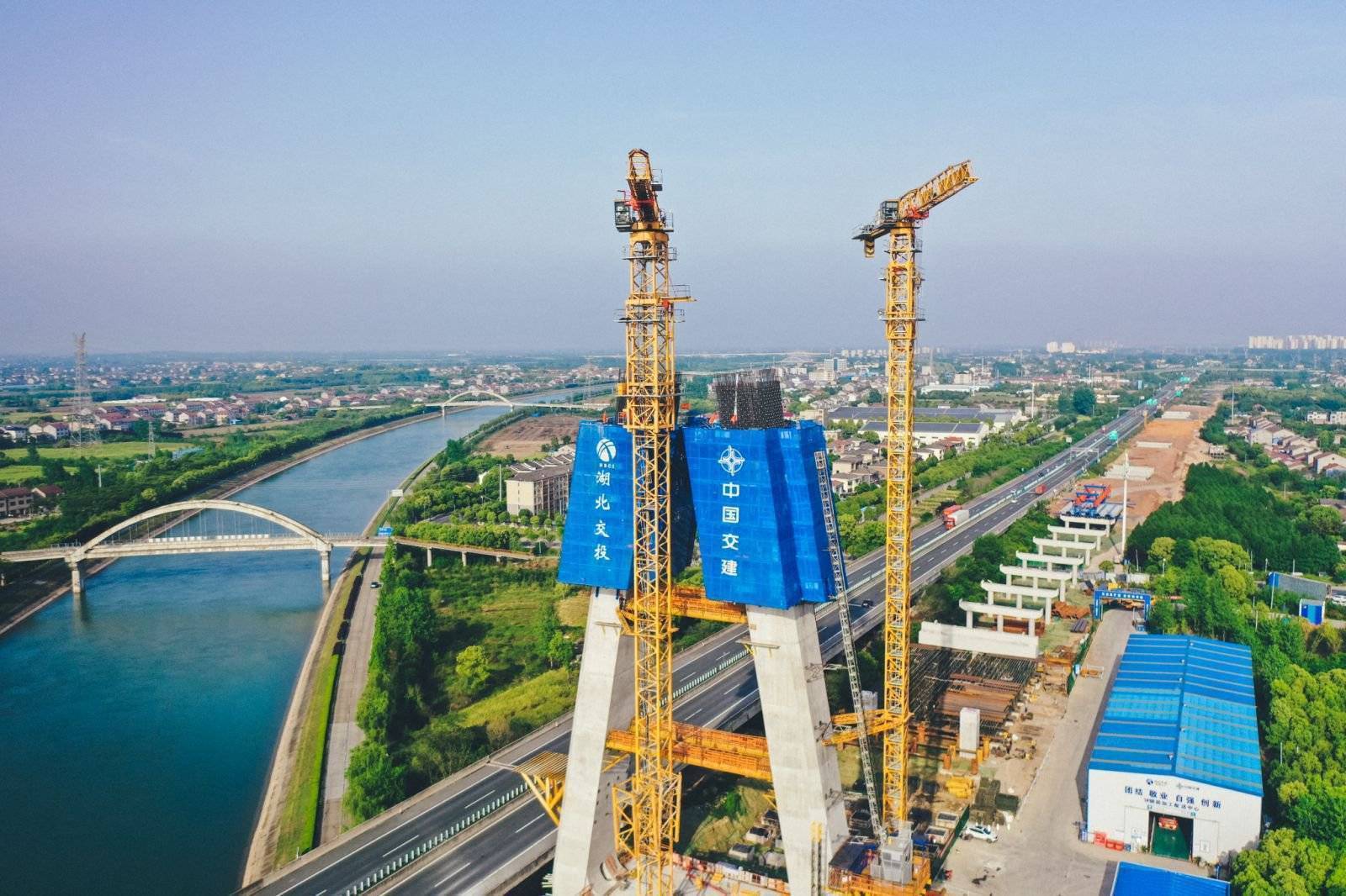 在邻近荆州江汉运河不远的工地,由中交路建承建的汉宜高速改扩建引江济汉特大桥塔吊挥舞,司机艾金龙则坐在空调房里轻松操作5G塔吊,22根群桩支撑的主塔正以平均每天0.6米的速度“长”高,预计8月底最后爬升至123.28米高,完成索塔施工。