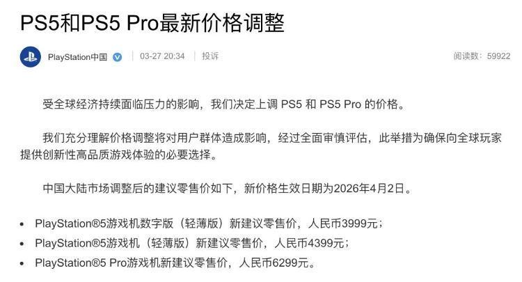 3月27日晚,索尼PlayStation中国方面表示,受全球经济持续承压影响,将上调国行PS5轻薄版与PS5 Pro的建议零售价,新价格自4月2日起正式生效。